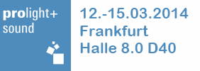 Erleben Sie uns auf der Prolight + Sound in Frankfurt, vom 12. bis 15. März 2014 Halle 8.0 Stand D40. Wir freuen uns auf Ihren Besuch.